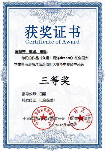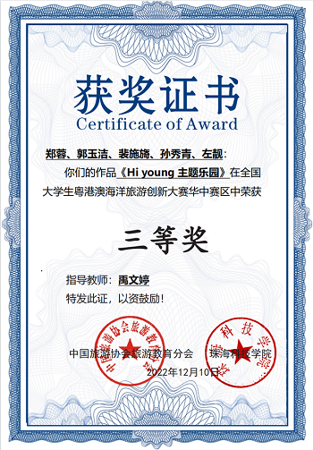 近日,由中国旅游协会旅游教育分会和珠海科技学院主办的全国大学生粤港澳海洋旅游创新大赛传来喜讯,我院旅游管理专业田媛老师指导的“海燕队”作品《久违!海洋Dream》(组员:2021级旅游管理专业周慧芳、郭媛和申缘)和禹文婷老师指导的“Hi底小分队”作品《Hi young 主题乐园》(组员:2021级旅游管理专业郑蓉、郭玉洁、裴施旖、左靓和2021级视觉传达设计专业孙秀青)荣获华中赛区三等奖,我院荣获“优秀组织奖”,这是我院学子首次参加该项赛事并获得奖项。