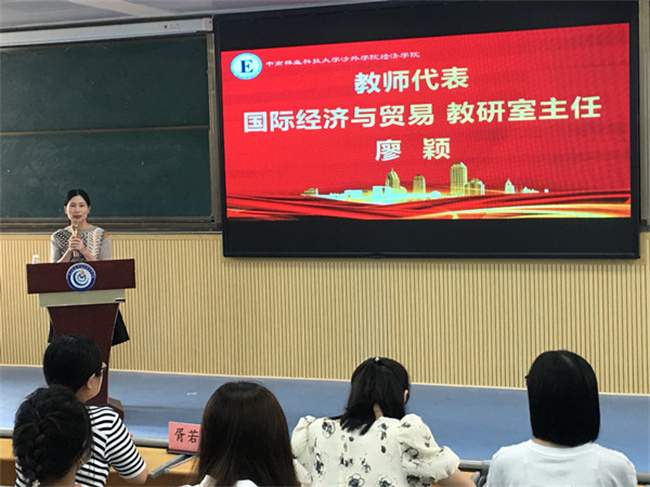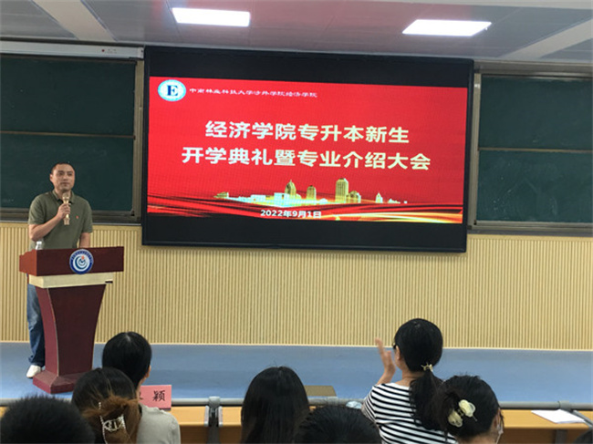 中南林涉外学院经济学院专升本新生开学典礼于9月1日下午15:00在一教学楼1310顺利举行。经济学院副院长胥若男、国贸教研室主任廖颖老师、金融教研室主任高雪老师、2022年专升本新生辅导员荣婷婷老师及部分教师代表出席开学典礼。本次典礼由经济学院党总支书记周迪主持,在庄严的国歌声中拉开序幕。