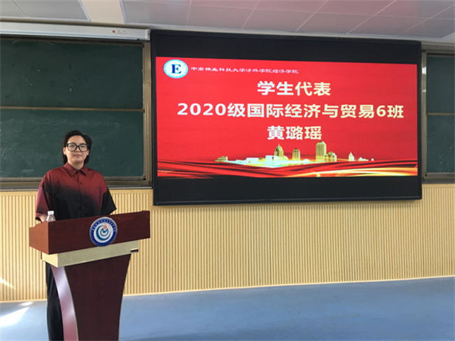 2020级国贸专业6班的黄璐瑶同学作为新生代表进行发言。她提到,处于人生最美阶段的我们要富于创新同时也要慎思明辨,珍惜来之不易的机会,对自身严格要求,并倡议全体同学尊师肯学,持之以恒,努力提升专业能力和综合素质,做顺应社会发展的有用之才。
