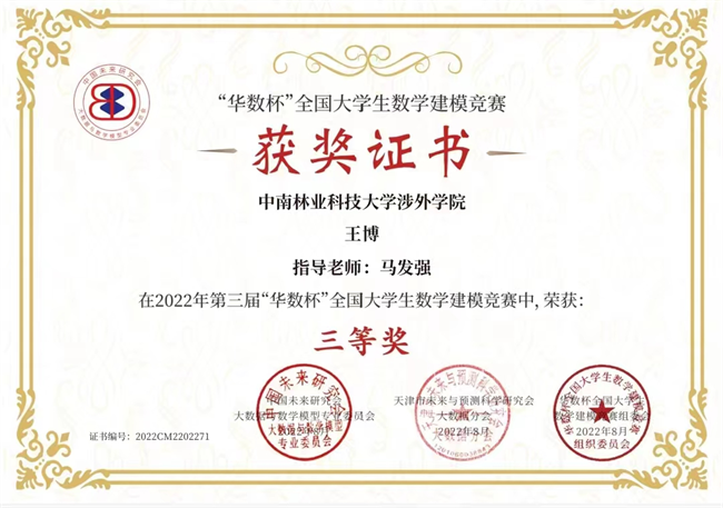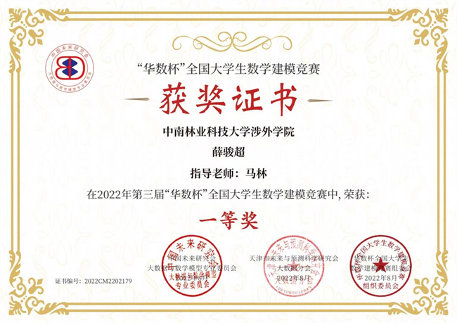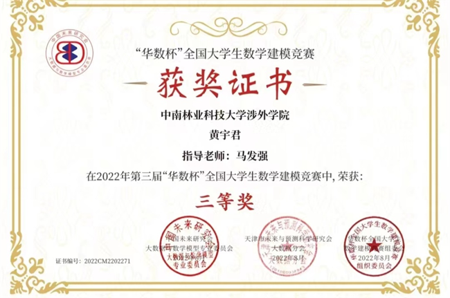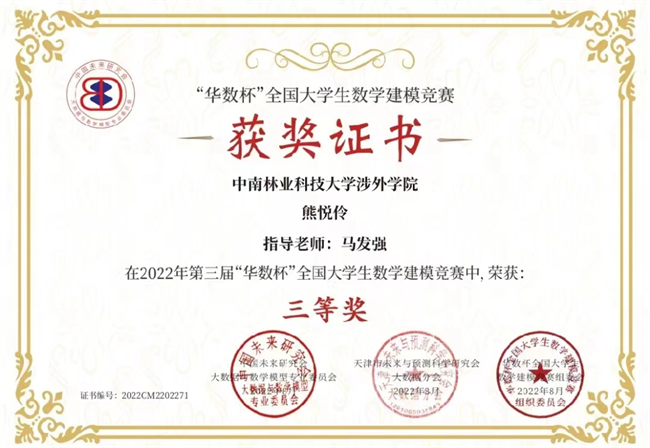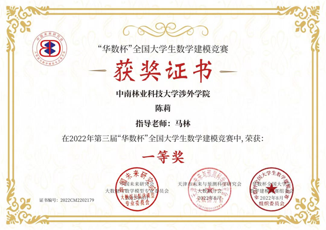 近日,从2022年“华数杯”全国大学生数学建模竞赛组委会传来喜讯。由我院数学教研室马林老师指导的刘洋、薛骏超、陈莉三位同学荣获全国一等奖;由马发强老师指导的熊悦玲、黄宇君、王博三位同学荣获全国三等奖。另外还有六支队伍亦喜获优秀奖。