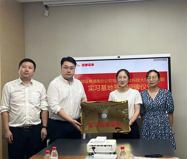 经济学院金融教研室主任高雪与西部证券湖南分公司总经理柴隆签署了校企战略合作协议,我院授予西部证券湖南分公司“实习就业基地”牌匾。