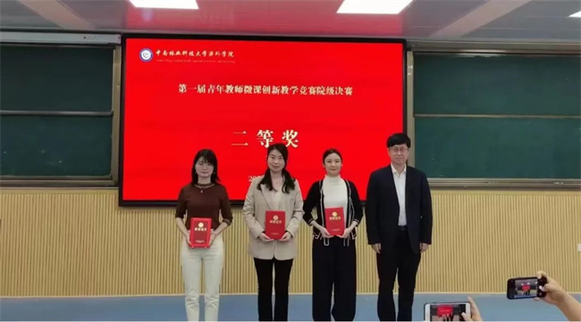经过激烈的角逐,传艺学院黄妮娜老师获得竞赛一等奖;管理学院袁榕婧老师、传艺学院黄岸老师、语言文化学院刘欢老师获得竞赛二等奖;信工学院罗井知和张芳老师、经济学院郭一笑和严辉老师、语言文化学院陈宁老师、马克思主义学院肖丽老师获得竞赛三等奖,院长周志宏为获奖教师颁发获奖证书。