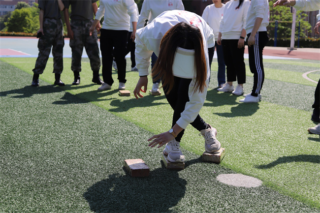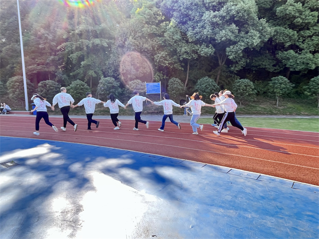 趣味接力赛,每组队员进行接力,第一棒为两人三足,第二棒为双人背靠背运气球,第三棒为转呼啦圈,第四棒为指压板跳绳,最后一棒携手冲刺,过程中需要多人合力完成。