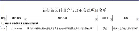 11月10日,教育部发布 《关于公布首批新文科研究与改革实践项目的通知》(教高厅函〔2021〕31号)文件,我院“面向乡村振兴文旅产业链人才需求的政产学研协同育人机制创新与实践”项目获批立项,入选“政产学研协同育人机制创新与实践”大类。该项目以我院旅游管理教学指导委员会主任罗芬教授为负责人,周志宏教授、李穗菡副教授、肖菲副教授等为项目组核心成员。