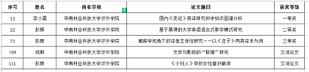 近日,由湖南高等教育学会大学外语专业委员会组织的“2021年度学术年会征文”评审结果揭晓,经专家匿名评审,在全省高校师生投稿的121篇论文中,中南林涉外语言文化学院李小霞获一等奖,彭辉两篇论文分别获得二、三等奖,成敏获交流论文奖。