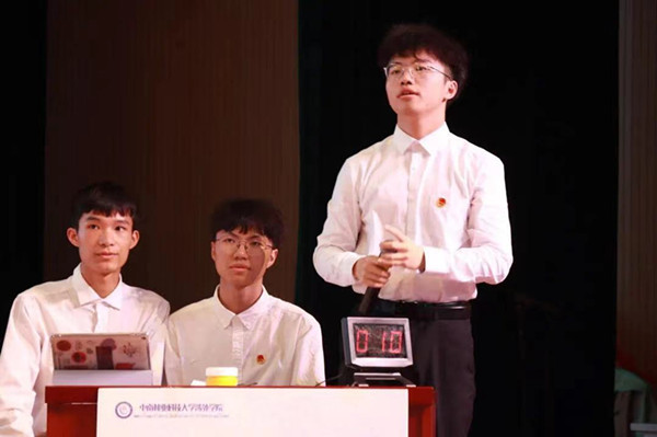 第二轮为抢答题,场上的气氛慢慢紧张起来。各队伍队员紧盯面前的抢答器,在“开始答题”指令发出后都以迅雷不及掩耳之势按下抢答按钮,说出心中的答案。遇到稍有难度的题目,大家会使用场外援助的机会,在观众席的同学们也毫不示弱地给出了令人满意的答案,因场上队员手速拉开的比分差距,也随之慢慢拉平。