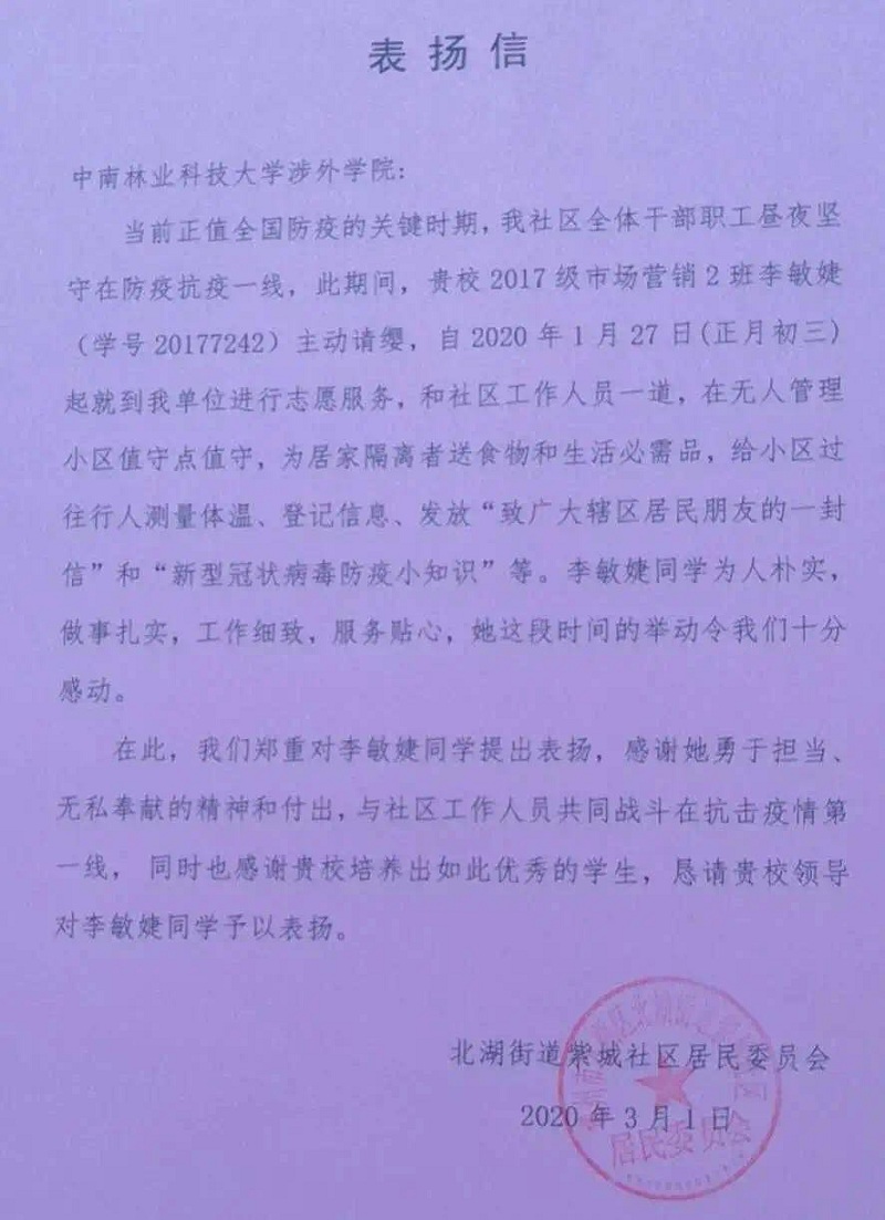 北湖街道紫城社区居民委员会寄来表扬信