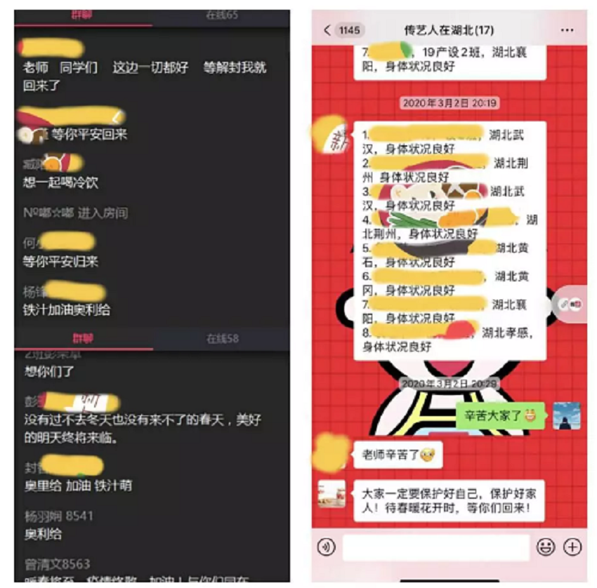 在传艺学院,有被滞留在湖北的老师同学,虽然不在一城,但学院老师同学的关心一直都在,我们之间被空间隔离,但心绪牵系,相互守望。