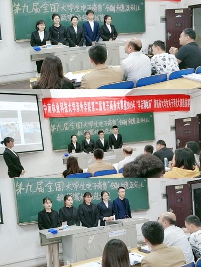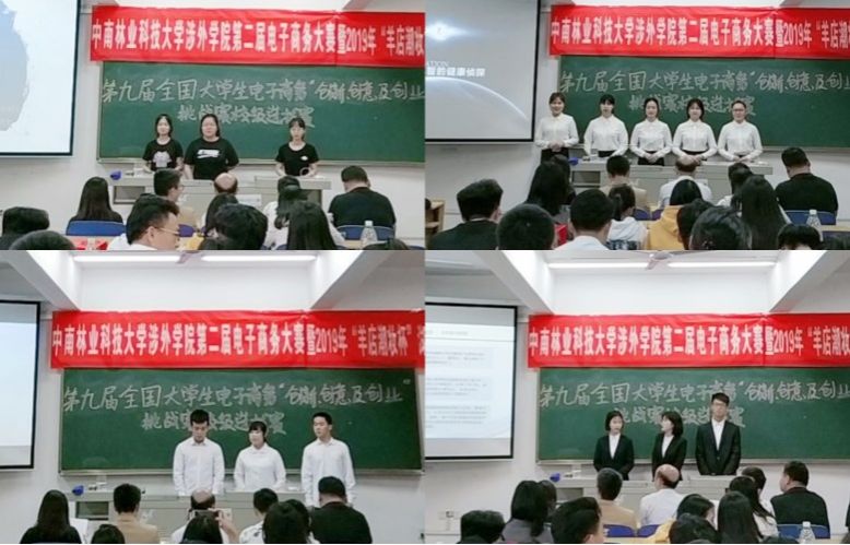 2019年5月15日下午两点在一教楼1303举行了中南林业科技大学涉外学院第二届电子商务大赛校内选拔赛。经济与管理学院刘天祥,学工部副部长粟臻,学工部副部长兼大学生创新创业中心主任艾亮杓,省赛赞助商御家汇股份有限公司的水羊国际“羊店潮妆”BD宋程程女士,水羊国际“羊店潮妆”运营经理李泽先生担任比赛嘉宾评委。