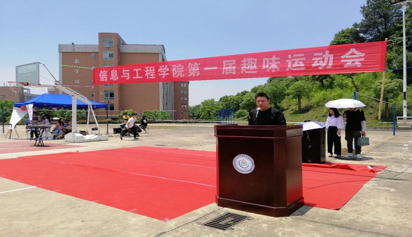 信息与工程学院副院长彭相华致辞表示通过举办趣味性的运动项目让同学们积极参与,发扬同学们的团队精神,提高信息与工程学院学生与教师合作和坚忍不拔的精神。