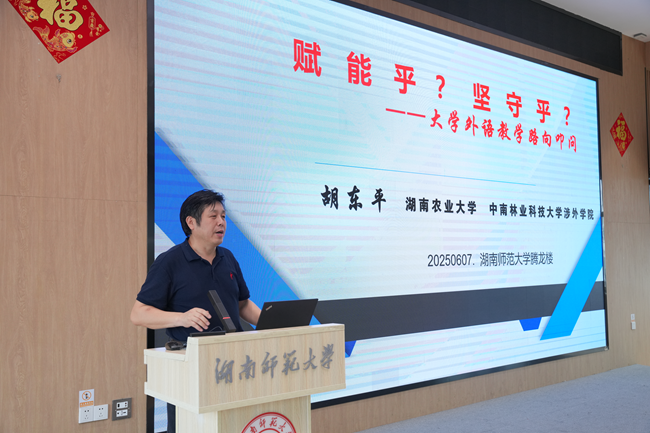 湖南大学刘正光教授以 “英语短视频实践育人”为切入点,从学理层面阐述 “做中学”的教育理念。他结合孔子、王阳明、陶行知等思想家的论述,强调实践是提升语言文化素养的核心路径。通过 “故事构思 — 拍摄制作 — 他者视角叙事” 的全流程实践,培养学生创新思维与跨文化传播能力。中南大学李清平教授以“问商:让AIGC可能、可行、可用”为题,深入探讨了AIGC 时代的提问艺术 ,指出 AI 本质是 “智能共同体”,其价值取决于人类提问的深度与精度。中南林业科技大学涉外学院语言文化学院院长胡东平教授在《赋能乎,坚守乎?—— 大学外语教学路向叩问》的主题报告中,聚焦赋能与守本两大痛点展开讨论。尝试提出了“被赋能”对外语教学改革的重要作用,同时呼吁外语教学界在寻求突破的同时,守语言之本,守教育之本,守文化之本。强调在赋能中突破、坚守中固本,以适应新时代人才培养与国家战略需求。