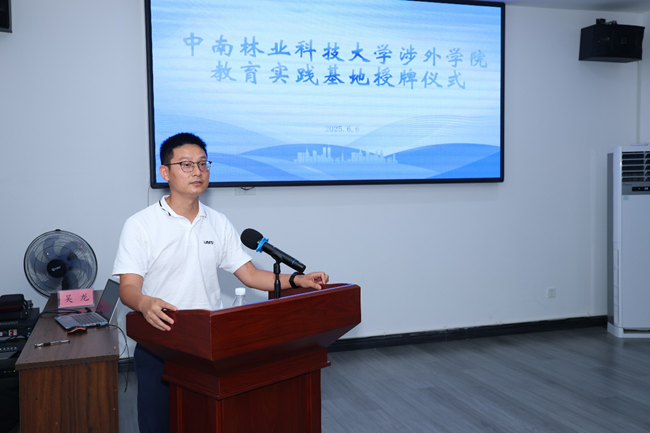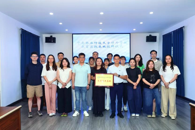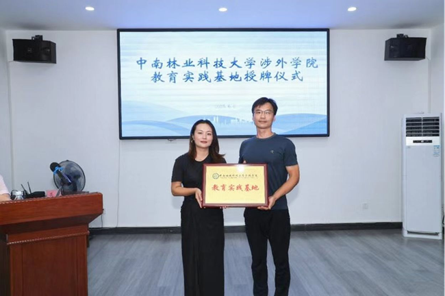 最后,范伶俐副处长向基地负责人蒋向明授予"中南林业科技大学涉外学院教育实践基地"牌匾,标志着校地协同育人开启新程。
