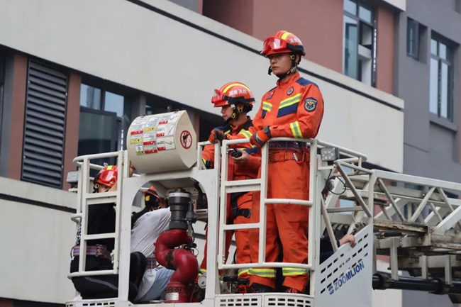 15:05,书堂山消防救援中队到达“火灾”现场,兵分两路,从东、西两个疏散走道紧急奔赴第10层和11层进行“灭火”,与此同时,第三消防战斗组,使用消防登高云梯对房间被困人员实施营救演练。在整个消防演练过程中,各部门密切协作,人员疏散安全有序,“火情”扑救和高空被困人员营救快速专业。在晨光运动场进行疏散人员列队清点人数,并为大家做消防知识、应急知识普及。