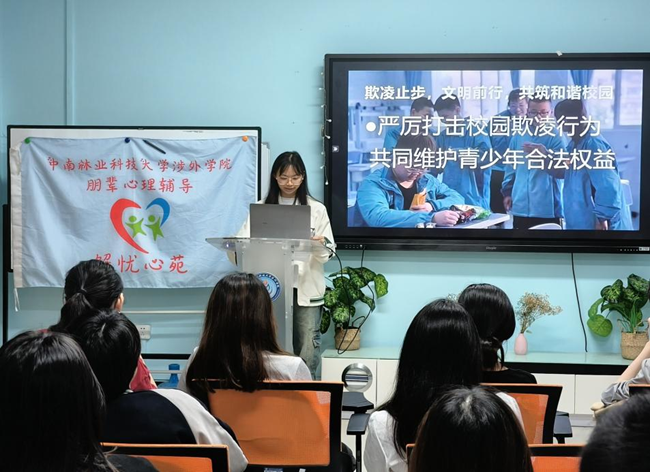学生工作处心理健康教育与咨询中心组织开展了“电影沙龙——校园霸凌”电影分享会和反校园暴力读书分享会,学生在活动中通过分享影视作品和文学著作,对校园霸凌造成的危害有了更加深入的认识和了解,进一步增强了学生的法治意识与自我防范意识。