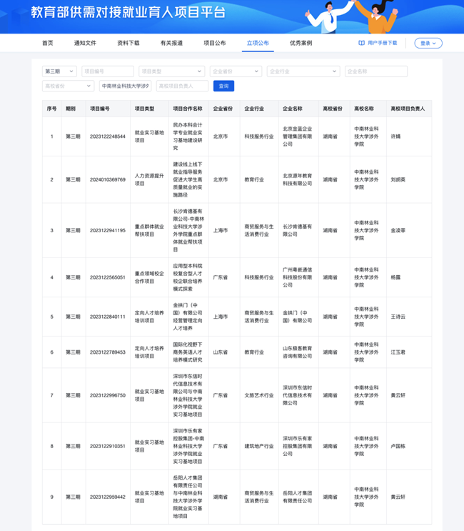 近日,全国普通高校毕业生就业创业指导委员会、教育部高校学生司发布《关于公布教育部第三期供需对接就业育人项目立项名单的通知》(教学司函〔2024〕23号),中南林业科技大学涉外学院9项供需对接育人项目顺利通过审批,获准立项,其中就业实习基地项目4项,定向人才培养培训项目2项,人力资源提升项目1项,重点领域校企合作项目1项,重点群体就业帮扶项目1项。