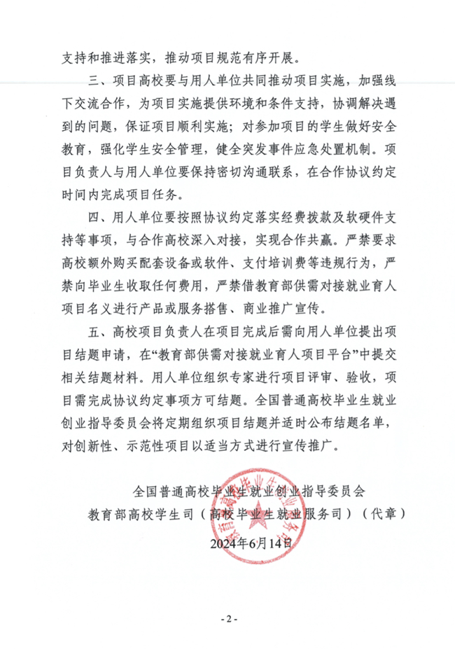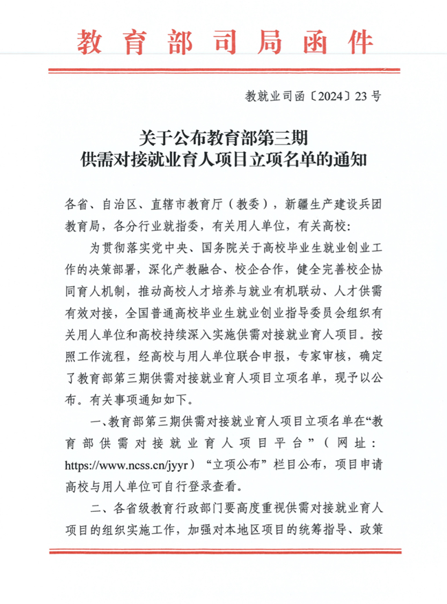 供需对接就业育人项目是教育部高校学生司落实党中央、国务院“稳就业”“保就业”决策部署,深化产教融合、校企合作,推动人才培养与就业有机联动、人才供需有效对接的重要举措。自2023年12月启动项目申报以来,学院积极响应、广泛动员、精心组织,与用人单位主动对接,建立深度合作关系。下一步,学院将与用人单位保持密切联系,根据项目协议深入开展交流合作,加强项目过程管理,确保项目顺利实施。