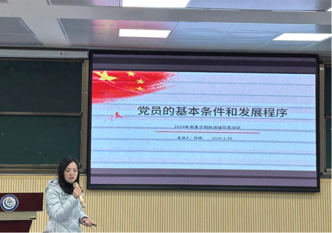 管理学院党总支书记钟依围绕党员的基本条件和党员的发展程序两方面,从新时期发展党员工作的十六字方针出发,就党员发展的环节步骤、发展党员综合材料、常见案例等方面阐述了过程和做法,为新进辅导员党建工作提供了思路和参考。