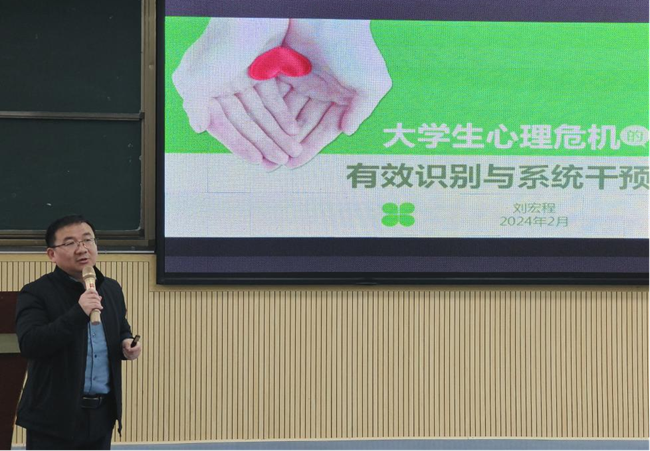 国家二级心理咨询师、中国心理学会注册心理师刘宏程副教授从大学生心理危机有效识别与系统干预出发,分享及时解决、持续跟进、及时总结等工作经验,强调重点关注时段与人群,解析危险的常见言语、行为和情绪信号;其次,明确学院心理危机干预工作流程,突出心理危机干预流程中的报告机制和注意事项;最后,通过对常见心理危机类型和处理方式的分享,探讨辅导员队伍在心理危机干预工作中的重难点。