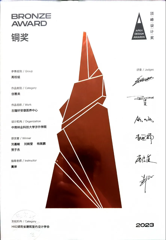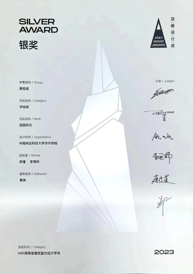 近日,由HIID湖南省建筑室内设计学会发起,联合湖南省建筑设计院集团股份有限公司、湖南省设计艺术家协会共同主办的第七届顶峰设计奖APEX学术论坛暨颁奖盛典在长沙君悦酒店举办。这是集建筑、室内设计于一体的全省顶级奖项,我院传媒与艺术设计学院环境设计专业学生凭借出色的创意和扎实的专业实力,在此次比赛中斩获了包括银奖一项、铜奖两项以及优秀奖四项在内的多项荣誉。