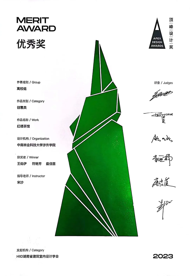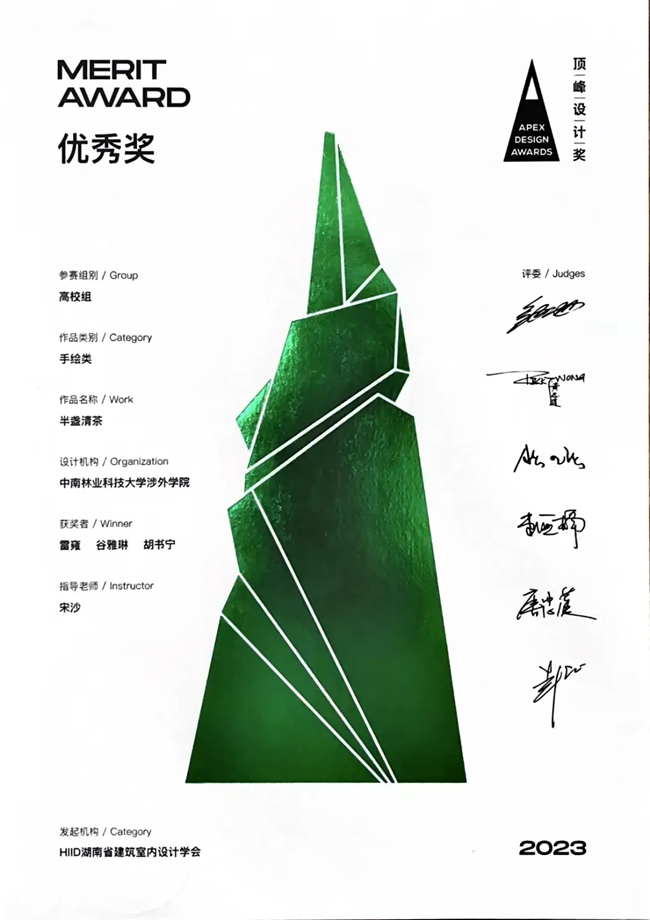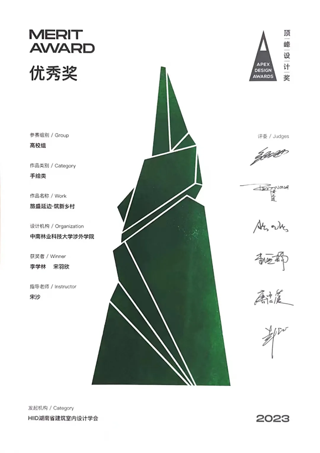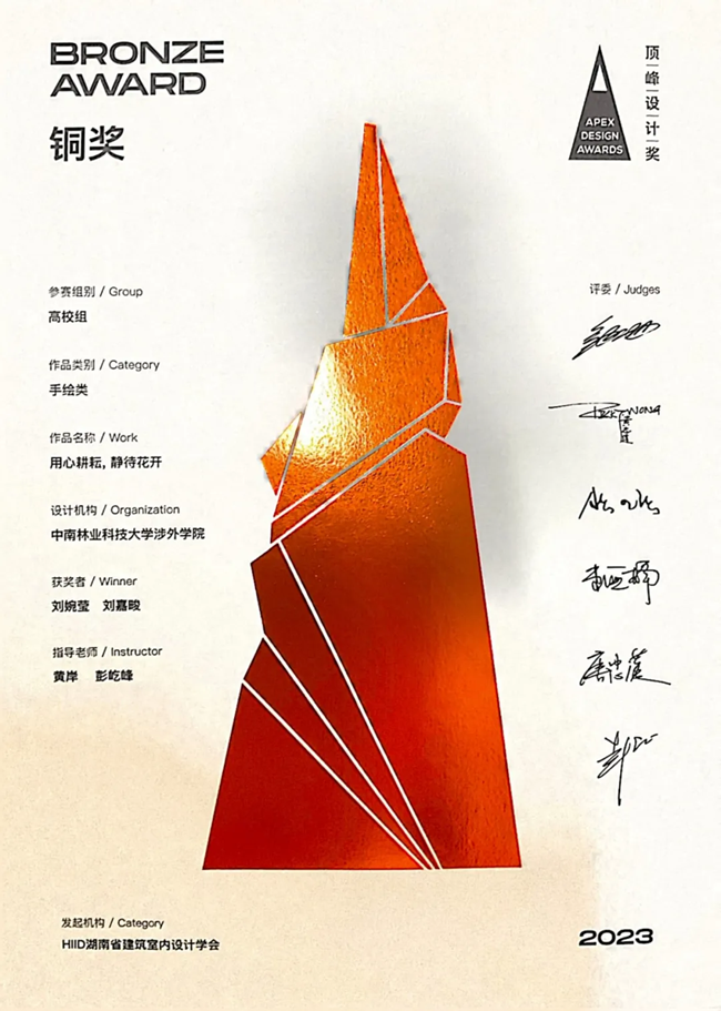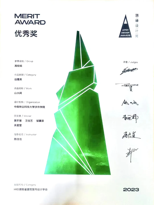在今年的顶峰设计奖中,中南林涉外学子以“湖南人的设计奖”为新核心,深入挖掘湖南设计文化的精髓,将本土元素与现代设计理念相结合,创作出了一系列具有原创性和创新性的设计作品。经过数十位国内、国际专家评委的严格评审,从全国一千多份参赛作品中脱颖而出,获得了优异的成绩。此次“顶峰设计奖”的获奖成绩,不仅是对环境设计专业学子设计才华的肯定,也是对专业教育水平的一次集中展示,学院将继续推动学科交叉融合和创新发展,为培养更多优秀的设计人才做出积极贡献。
