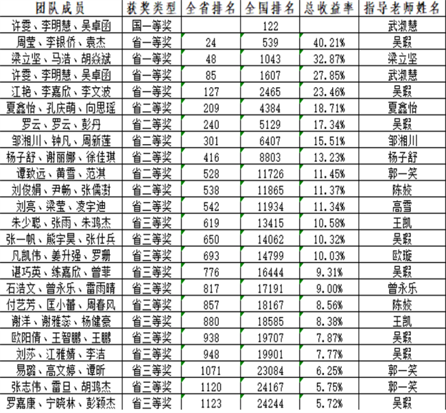 本届大赛规模庞大,覆盖湖南大学、中南大学等全国2570所高校,超71万在校大学生参加,参赛高校数和参赛人数达到了历届之最。我院积极组织金融专业教师团队负责本次比赛的组织、报名及指导工作,经过师生们三个多月的不懈努力,经过校内选拔赛-省赛-全国总决赛三阶段的激烈角逐,我院经济学院武淑慧老师指导的参赛团队最终实现收益率27.82%,从17055支晋级全国总决赛的队伍中脱颖而出,全国排名第122位,获得总决赛一等奖!此外,在6月16日结束的湖南省省区决赛中,我院参赛队伍表现亮眼,获得4个省赛一等奖,7个省赛二等奖和12个省赛三等奖。