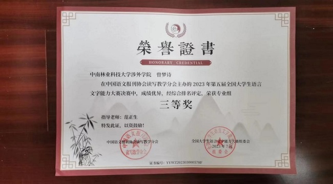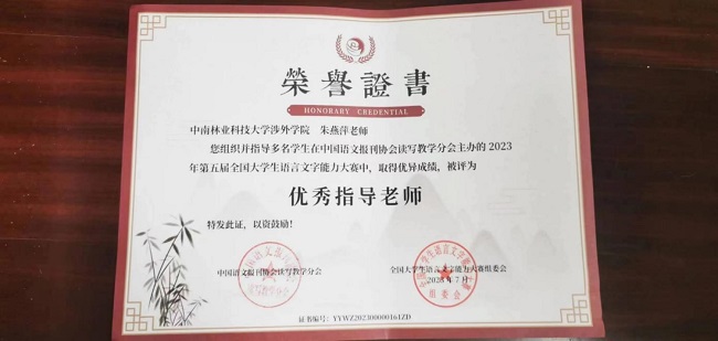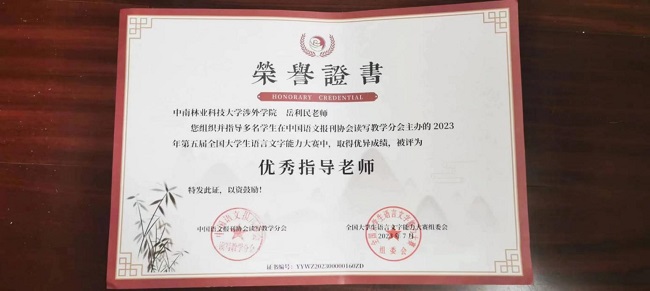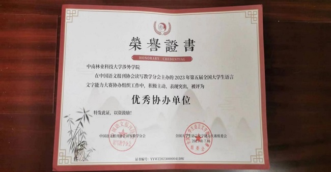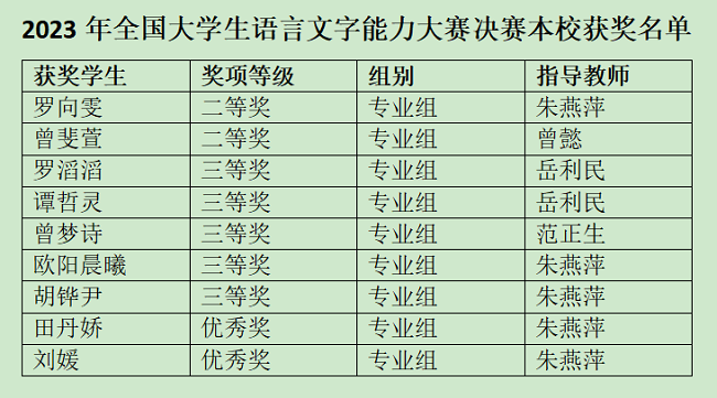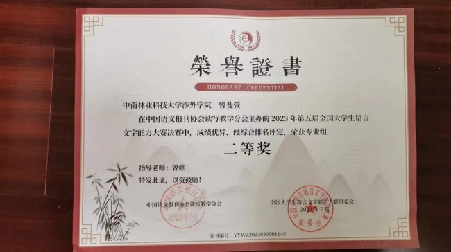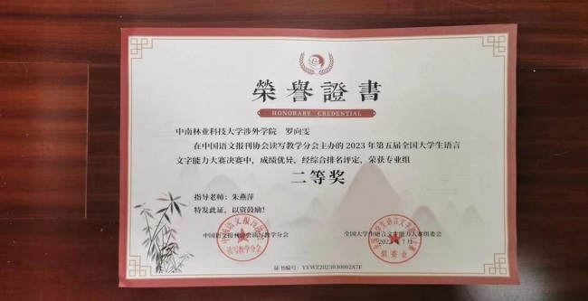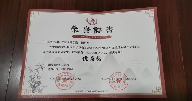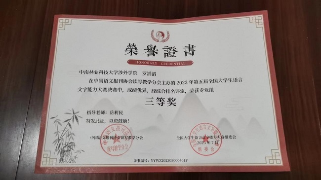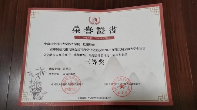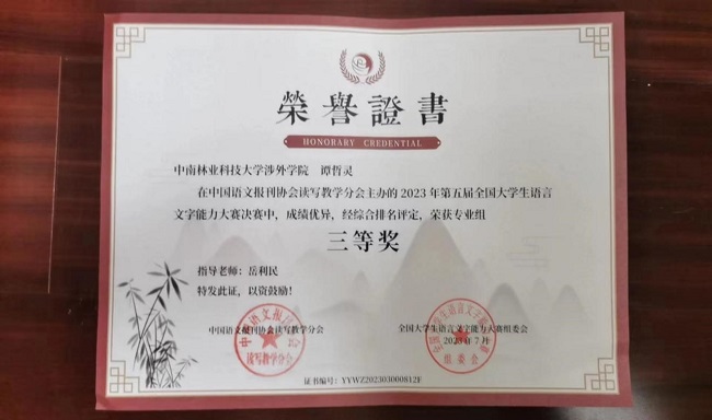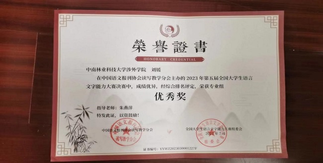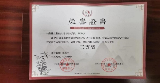 近日,由中国语文报刊协会读写教学分会主办的第五届全国大学生语言文字能力大赛圆满落幕。中南林业科技大学涉外学院共9名学生在决赛中喜获佳绩,其中二等奖2名,三等奖5名,优秀奖2名;汉语言文学教研室朱燕萍老师与岳利民老师获得优秀指导老师奖。这不仅是我院师生共同努力的结果,也体现我院语言文字教育的水平。