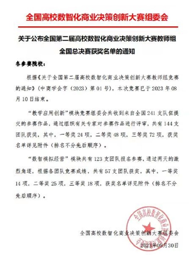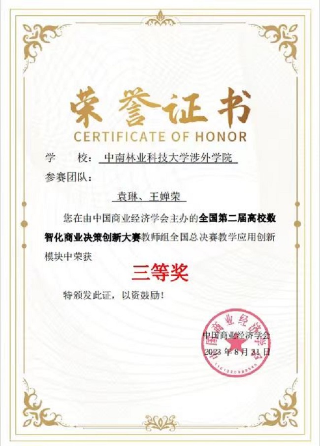 8月31日,全国高校数智化商业决策创新大赛组委会发布《关于公布全国第二届高校数智化商业决策创新大赛教师组全国总决赛获奖名单的通知》,中南林业科技大学涉外学院信息与工程学院教师袁琳、经济学院教师王婵荣在本次大赛中荣获三等奖。
