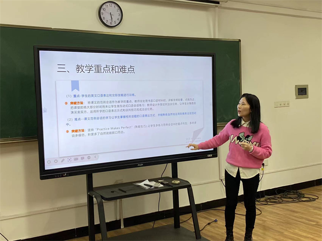 本轮打磨课程为《外贸英语口语》,由国际经济与贸易教研室主任廖颖老师就节选内容的教学设计思想进行分析和概括;讲课部分由国际贸易专业唐言晴老师进行现场课堂教学实践,实施教学设计及分析,展示教学技能。