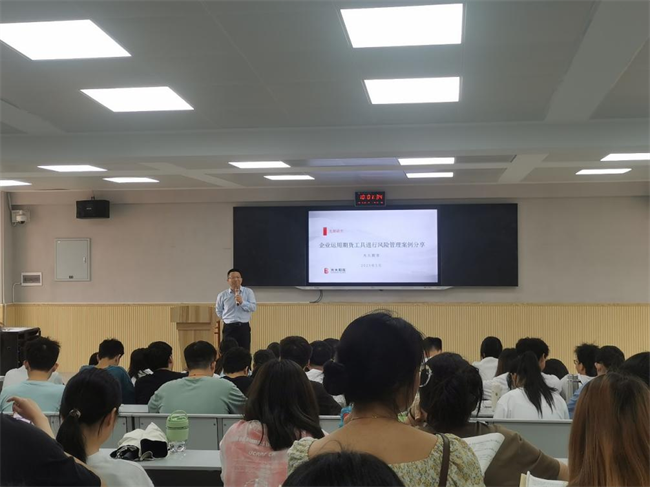 讲座由光大期货有限公司湖南分公司总经理金充泽主讲,吸引了众多同学前往聆听。金充泽经理通过分享企业运用期货工具管理风险的案例,激发了同学们对风险管理的思考和对期货市场的兴趣,同时还介绍了风险管理的种类及基本交易规则,使学生进一步了解期货市场并正确认识期货工具。