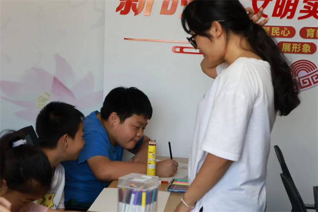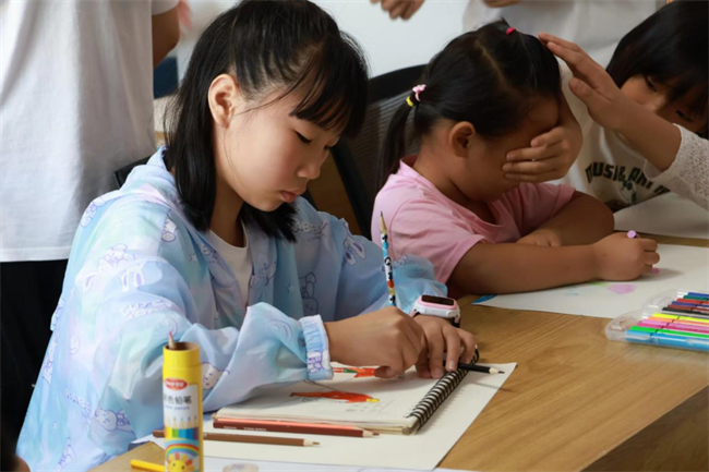 授课结束,志愿者们分发绘画工具,开始进行分组绘画指导,小朋友们纷纷绘出“印象里的长沙”。