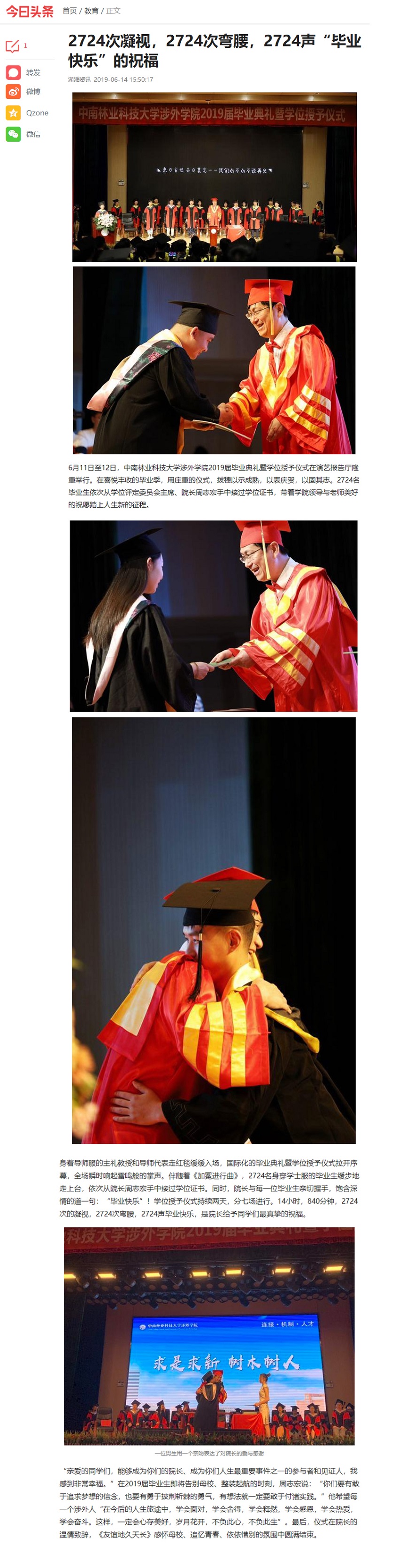 6月11日至12日,中南林业科技大学涉外学院2019届毕业典礼暨学位授予仪式在演艺报告厅隆重举行,受到了今日头条的报道。