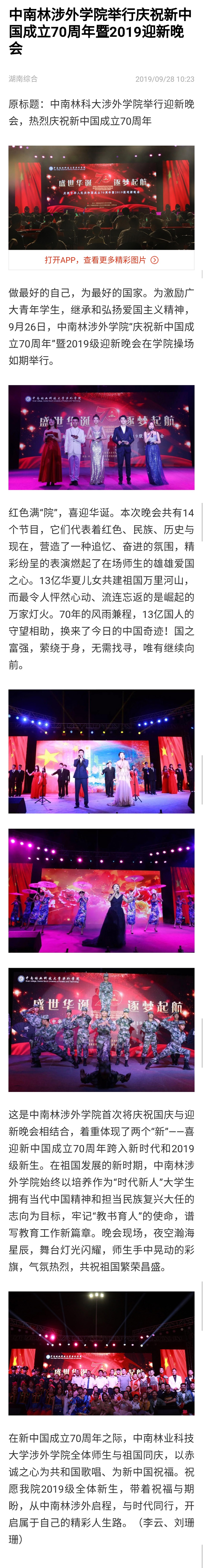 【搜狐新闻】中南林涉外学院举行庆祝新中国成立70周年暨2019迎新晚会