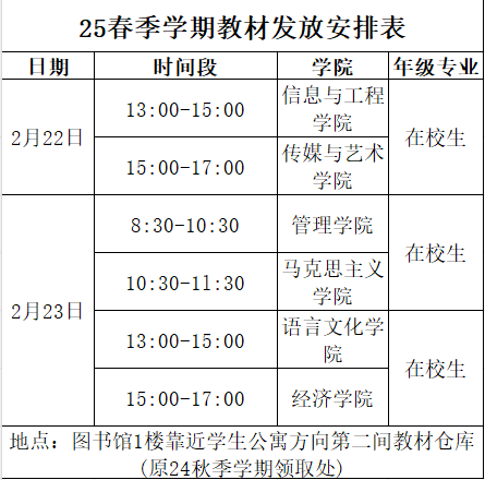根据学院教务工作安排,定于2月22日下午-2月23日发放2025年春季学期在校生教材。为保证春季学期教材的正常发放,学院教学工作的有序进行,现将有关教材发放的准备工作通知如下: