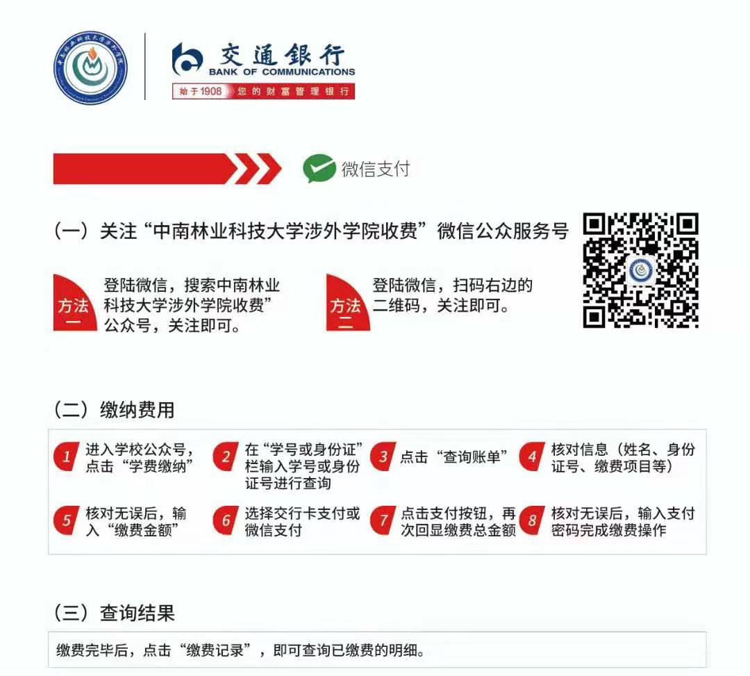 3、本次重修报名,学生个人需用手机登录微信,搜索中南林业科技大学涉外学院收费公众号,关注进行报名,缴费名称为:2023年秋季学期重修。二维码等详见(附件一缴费流程,请确认需重修科目后再进行缴费,退伍或因病免修的同学请勿对可免缴重修费科目进行缴费,学籍异动或转专业学生需仔细确认需重修科目,错缴或多缴无法退费!!!)