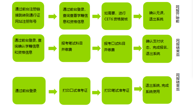 n CET笔试考试进行前的所有操作都在本系统进行,包括报名、缴费、打印准考证。