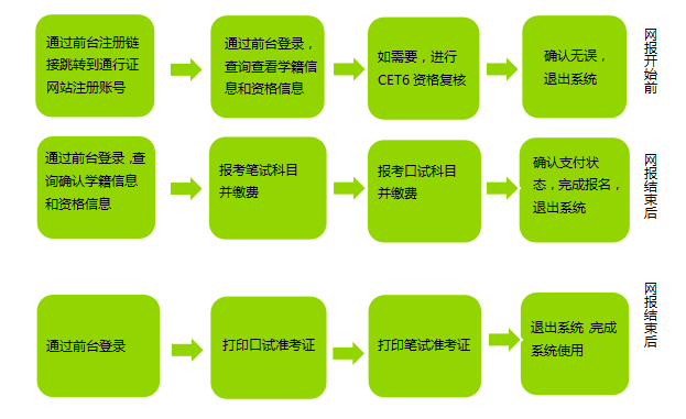 n CET笔试考试进行前的所有操作都在本系统进行,包括报名、缴费、打印准考证。