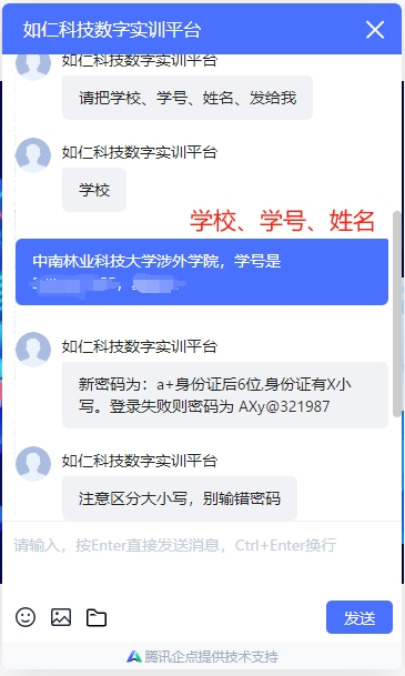 在咨询对话框中输入以下信息:“申请密码修改+学校全称(中南林业科技大学涉外学院)+学号+姓名”。