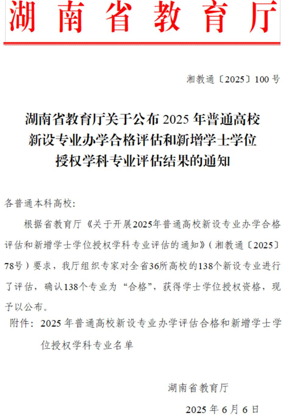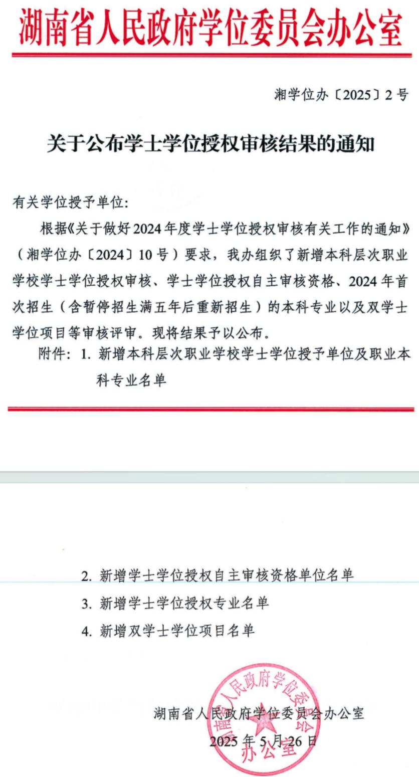 近日,湖南省人民政府学位委员会办公室、省教育厅先后发布《关于公布学士学位授权审核结果的通知》、《湖南省教育厅关于公布2025年普通高校新设专业办学合格评估和新增学士学位授权学科专业评估结果的通知》,我院人工智能、国际商务、电子商务、数据科学与大数据技术4个专业顺利通过学士学位授权审核,获得学士学位授予权。