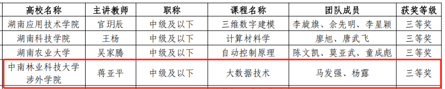 其中,我院信息与工程学院蒋亚平团队(团队成员:马发强、杨露)获得湖南省普通高校教师教学创新大赛新工科组三等奖,管理学院覃晓梅团队(团队成员:陈莉、韩雪、柴娟娟)获得湖南省普通高校教师教学创新大赛产教融合组三等奖。