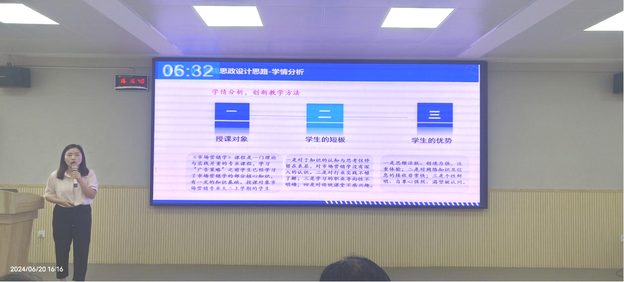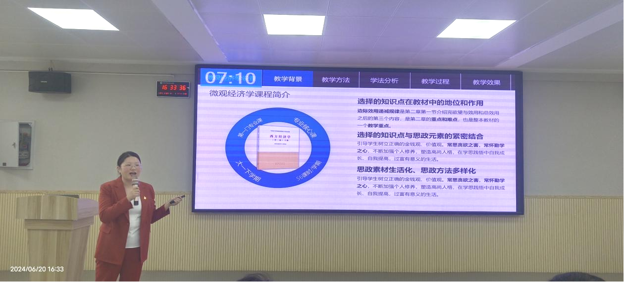 在比赛过程中,11位参赛教师以一堂课的内容为载体进行教学设计,分别从课程思政的教学目标、教学设计思路、课程亮点等方面进行阐述,结合自身课程特点,深入挖掘思政元素,巧妙融合专业知识,以出色的教学设计和精彩的教学展示,展现出深厚的教学功力和独特风采。