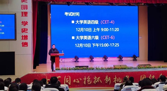 为进一步严肃考风考纪,确保2022年下半年全国大学英语四、六级考试工作顺利开展,教务处于12月8日下午在学院报告厅召开2022年下半年全国英语四、六级等级考试考务工作培训会。学院副院长马宗艳、教务处负责人方东玉、全体考务工作人员及全体监考老师参会。会议由学院副院长马宗艳主持。