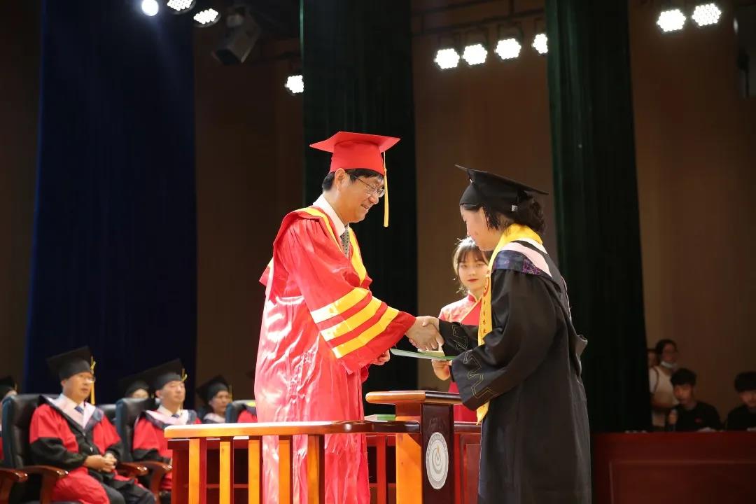 学位评定委员会主席、院长周志宏开始为学士学位获得者颁授学位,每一次微笑、弯腰、握手、“毕业快乐”,是对毕业生最真诚的祝福。