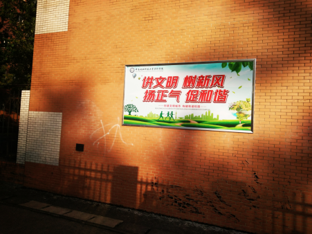 为增强青年学生社会主义核心价值观,做好疫情防控工作,时刻提醒同学们注意个人卫生防护、树立文明新风意识,学院在学生公寓主干道墙上悬挂了各类文明宣传展报。