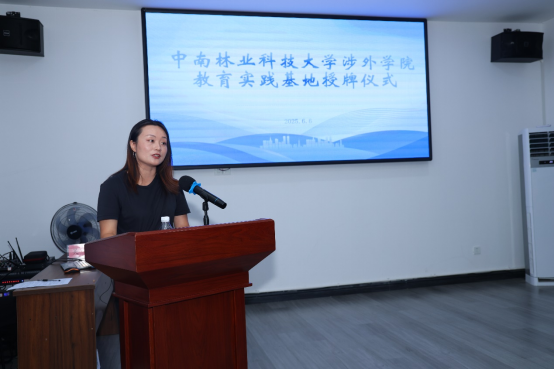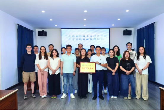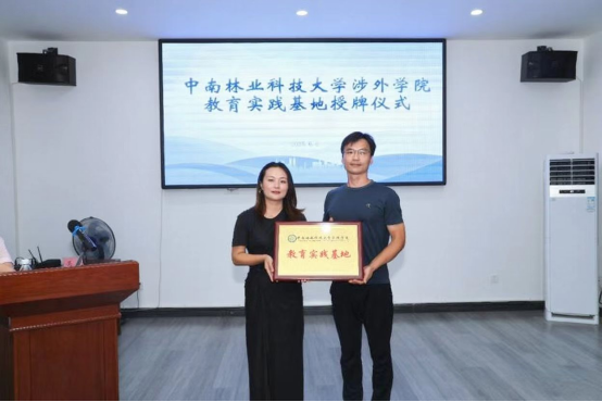最后,范伶俐副处长向基地负责人蒋向明授予"中南林业科技大学涉外学院教育实践基地"牌匾,标志着校地协同育人开启新程。