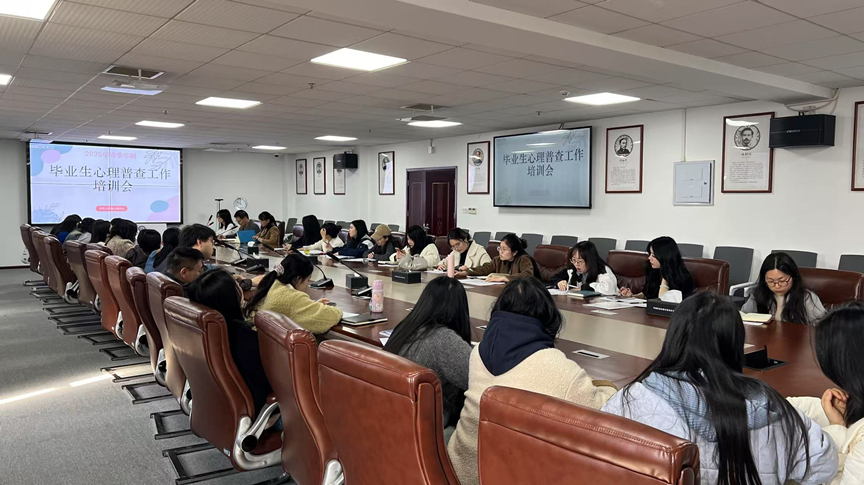 为深入贯彻落实教育部关于加强大学生心理健康教育工作的相关要求,进一步完善心理危机预防与干预机制,确保2025届毕业生心理普查工作顺利开展,学生工作处心理中心于2025年3月21日在行知楼六楼会议室组织召开了2025届毕业生心理普查工作培训会。学生工作处负责人甘叶青及各二级学院心理主管、全体毕业班辅导员和心理中心全体老师参加了此次培训。