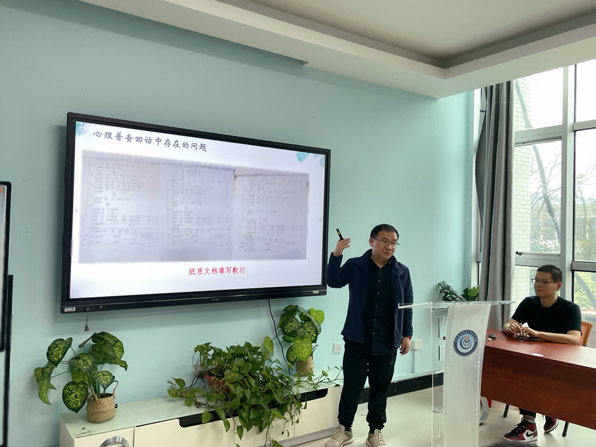 心理中心主任刘宏程就回访过程中可能遇到的难点进行了重点讲解和操作细则的解读,并针对不同环节提出可使用的回访技巧,他指出心理健康是一个动态的过程,只有持续关注,及时收集信息才能健全学生心理健康档案。
