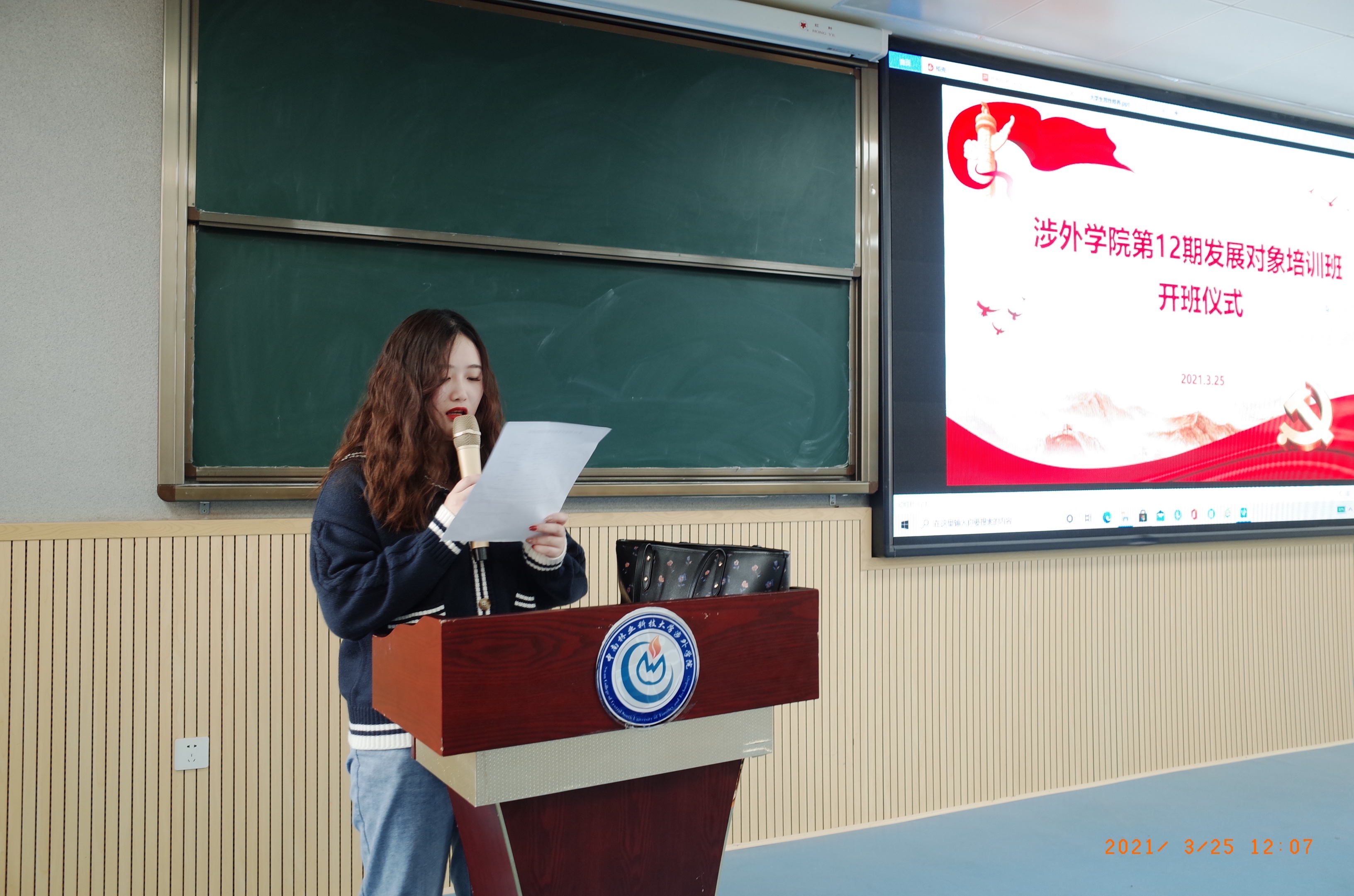 3月25日,涉外学院第十二期党员发展对象培训班开班仪式在1310教室举行。学生工作处副处长徐婷出席开班仪式,开班仪式由班主任钱梦婷老师主持。